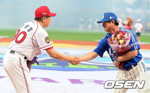 19일 오후 경북 포항시 포항야구장에서 열린 '2013 한국야쿠르트 세븐 프로야구 올스타전' 경기, 경기에 앞서 웨스턴 올스타 선동렬 감독과 이스턴 올스타 류중일 감독이 악수를 나누고 있다.