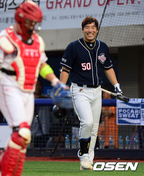 19일 오후 경북 포항시 포항야구장에서 열린 '2013 한국야쿠르트 세븐 프로야구 올스타전' 경기 1회말 1사 김현수가 찰리의 몸쪽공에 깜짝 놀란 후 미소를 짓고 있다.