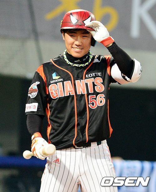 19일 오후 경북 포항시 포항야구장에서 열린 '2013 한국야쿠르트 세븐 프로야구 올스타전' 경기, 3회초 1사 1루에서 타석에 들어선 롯데 신본기가 스파이더맨 헬맷을 쓰고 나오고 있다.