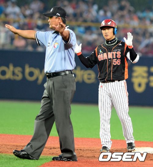 19일 오후 경북 포항시 포항야구장에서 열린 '2013 한국야쿠르트 세븐 프로야구 올스타전' 경기, 3회초 1사 1루에서 롯데 신본기가 1타점 적시 2루타를 날리고 타임을 요청하고 있다.