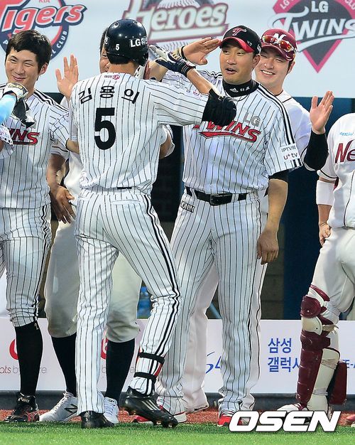 19일 오후 경북 포항시 포항야구장에서 열린 '2013 한국야쿠르트 세븐 프로야구 올스타전' 경기, 2회말 1사 1루에서 웨스턴 김용의가 선제 투런포를 날리고 봉중근과 경례 세레모니를 하고 있다.