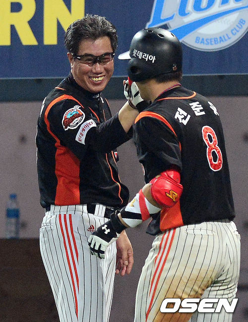 19일 오후 경북 포항시 포항야구장에서 열린 '2013 한국야쿠르트 세븐 프로야구 올스타전' 경기 7회초 2사 2루 전준우가 투런포를 친 후 덕아웃에서 김시진 감독과 하이파이브를 하고 있다.