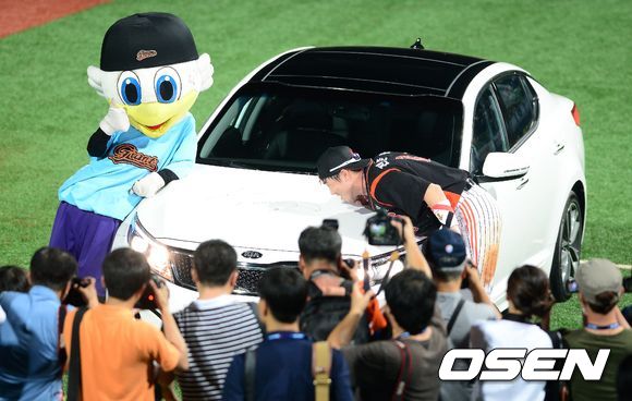 미스터 올스타로 선정된 롯데 전준우가 부상으로 마련된 중형차에 사인을 하고 키스를 하고 있다./jpnews@osen.co.kr