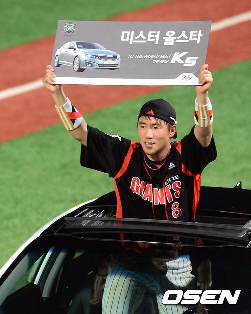 미스터 올스타로 선정된 롯데 전준우가 부상으로 마련된 중형차에서 포즈를 취하고 있다./jpnews@osen.co.kr