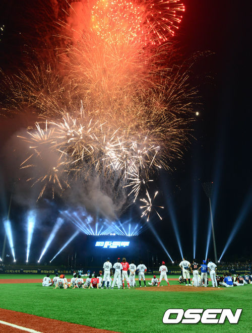 19일 오후 경북 포항시 포항야구장에서 열린 '2013 한국야쿠르트 세븐 프로야구 올스타전' 경기 종료후 불꽃놀이가 펼쳐지고 있다.