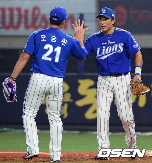 19일 오후 경북 포항시 포항야구장에서 열린 '2013 한국야쿠르트 세븐 프로야구 올스타전' 경기 종료후 이승엽과 오승환이 하이파이브를 하고 있다.