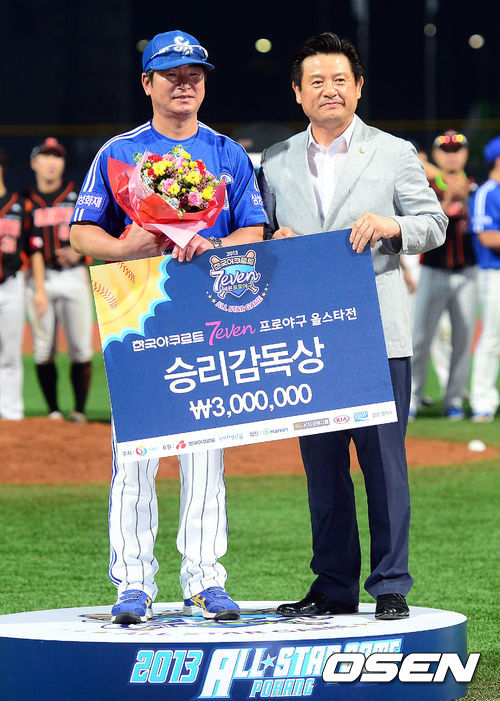 19일 오후 경북 포항시 포항야구장에서 열린 '2013 한국야쿠르트 세븐 프로야구 올스타전' 경기 종료후 승리감독상을 수상한 류중일 감독이 기념촬영을 하고 있다.