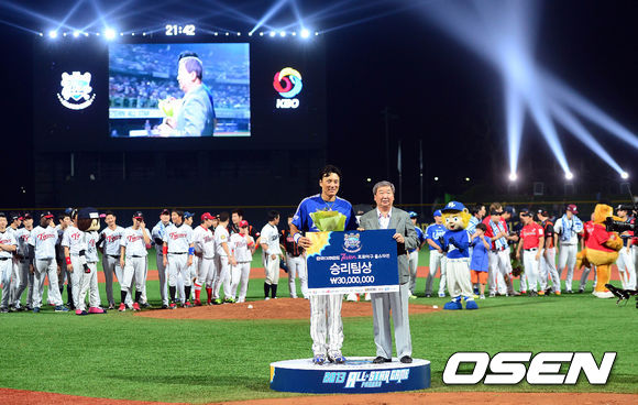 19일 오후 경북 포항시 포항야구장에서 열린 '2013 한국야쿠르트 세븐 프로야구 올스타전' 경기 종료후 이승엽이 승리팀 이스턴을 대표로 승리팀상을 수상하고 있다.