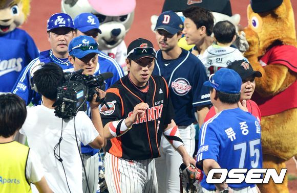 경기후 이스턴 전준우가 류중일 감독과 승리 하이파이브를 하고 있다./jpnews@osen.co.kr