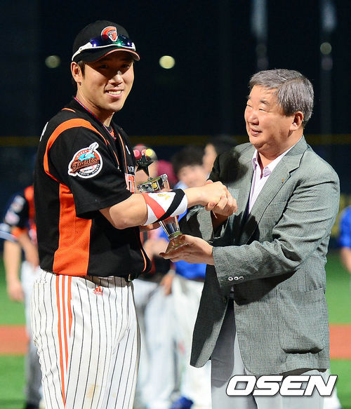 19일 오후 경북 포항시 포항야구장에서 열린 '2013 한국야쿠르트 세븐 프로야구 올스타전' 경기 종료후 MVP를 수상한 전준우가 구본능 KBO총재와 기념촬영을 갖고 있다.