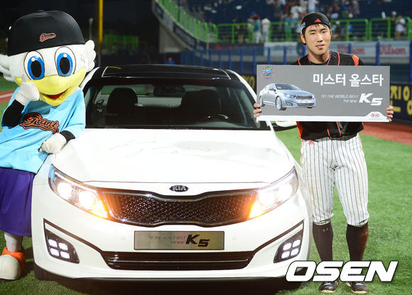 19일 오후 경북 포항시 포항야구장에서 열린 '2013 한국야쿠르트 세븐 프로야구 올스타전' 경기 종료후 '미스터 올스타'를 수상한 전준우가 부상으로 받은 자동차 옆에서 기념촬영을 하고 있다.