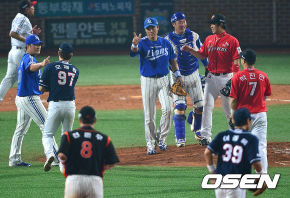 19일 오후 경북 포항시 포항야구장에서 '2013 한국야쿠르트 세븐 프로야구 올스타전'이 열렸다. 역전승을 거둔 이스턴 올스타팀 선수들이 하이파이브를 나누고 있다.
