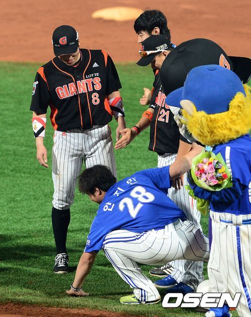 이스턴 안지만이 미스터 올스타로 선정된 롯데 전준우가 시상대로 향하기 앞서 그라운드를 손으로 닦고 있다. /jpnews@osen.co.kr