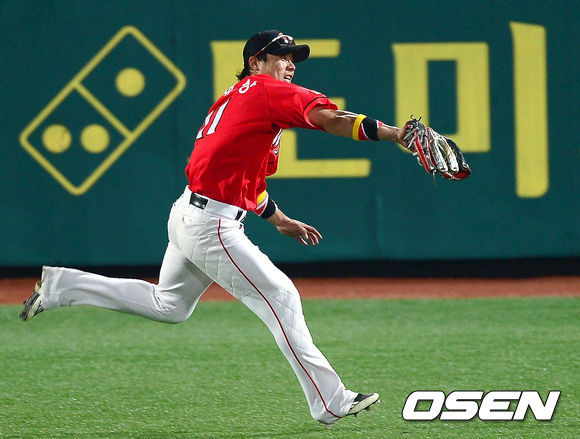 지난 13일 SK 박재상의 예술적인 점프 캐치 수비가 7월 둘째 주 'ADT캡스플레이'로 선정됐다.