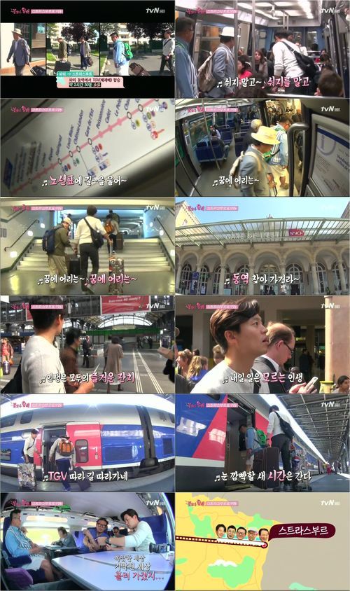 ‘꽃할배’들과 이서진이 TGV(테제베)를 타기 위해 파리 동역으로 이동하는 지하철 장면에서는 ‘쉬지 말고 쉬지를 말고 달빛에 길을 물어 꿈에 어리는 꿈에 어리는 항구 찾아 가거라’라는 가사가 등장했는가 하면, 스트라스부르로 향하는 TGV(테제베)에서 담소를 나누며 함박웃음을 짓는 ‘꽃할배’들의 모습에서는 ‘인생은 모두의 즐거운 잔치 힘껏 흔들어 다 같이 내일 일은 모르는 인생. 바람을 따라 길 따라 가네 눈 깜빡 할 새 시간은 갔네 복잡한 세상 기막힌 세상 흘러들 갔네’라는 가사 부분이 선보여 흥겨운 분위기를 더했다.