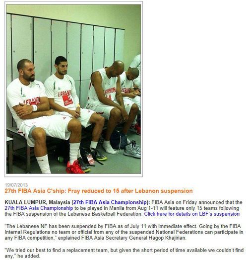 국제농구연맹(FIBA) 아시아지부는 19일 공식홈페이지를 통해 레바논농구협회에 '앞으로 4년간 국제대회에 나설 수 없는 중징계를 내린다'고 발표했다. 이로써 레바논은 오는 8월 필리핀에서 개최되는 아시아선수권은 물론 내년 인천에서 개최되는 2014년 인천 아시안게임에도 나올 수 없다. 아시아선수권은 레바논을 제외한 15개국만으로 치르게 됐다.