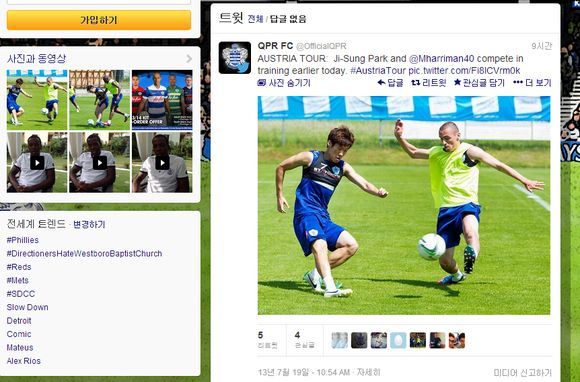 QPR 공식트위터는 20일 훈련에 열중하고 있는 박지성의 사진을 공개했다. 이어 “박지성이 오전훈련을 잘 마쳤다”고 전했다. 사진 속에서 박지성은 청백전으로 나눈 자체훈련에서 동료들과 공을 다투고 있다.