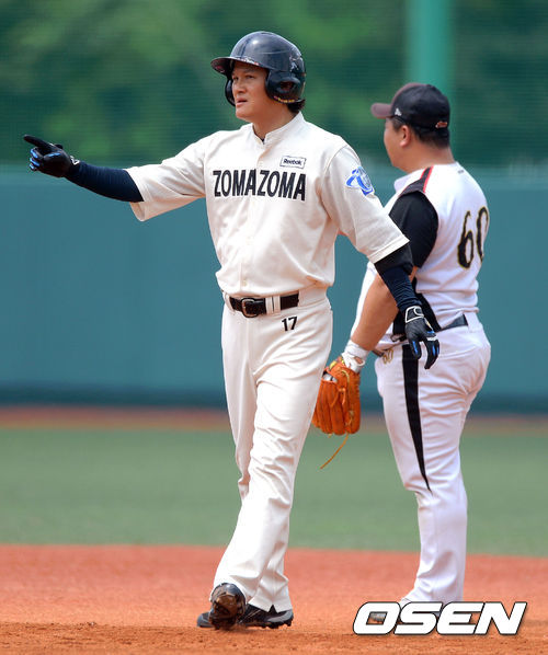 20일 오후 서울 구의야구장에서 열린 '제4회 니베아 맨 컵 전국생활체육 야구대회' 8강 조마조마와 GMB의 경기. 1회초 2사 2루 조마조마 강성진이 외야플라이를 날렸지만 GMB 중견수의 실책으로 동점 후 동료들을 항해 손짓하고 있다