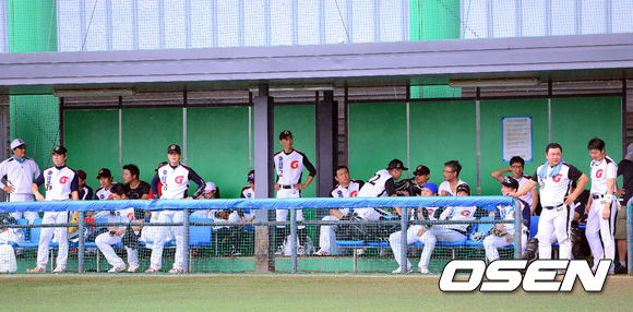 20일 오후 서울 구의야구장에서 열린 '제4회 니베아 맨 컵 전국생활체육 야구대회' 8강 조마조마와 GMB의 경기. 2회말 갑작스럽게 내린 비로 경기가 중단된 후GMB 선수들이 더그아웃에 앉아 비가 그치기를 기다리고 있다.