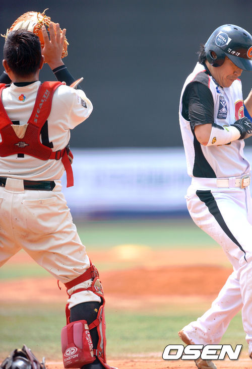 20일 오후 서울 구의야구장에서 열린 '제4회 니베아 맨 컵 전국생활체육 야구대회' 8강 조마조마와 GMB의 경기. 3회초 2사 만루 GMB 방석진이 만루 그라운드 홈런을 날린 후 홈을 밟고 있다.