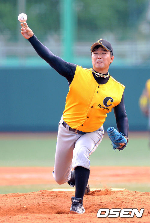 20일 오후 서울 구의야구장에서 열린 '제4회 니베아 맨 컵 전국생활체육 야구대회' 8강 챔피언과 외인구단의 경기. 1회초 챔피언 윤준범 선발투수가 역투하고 있다