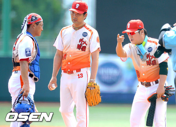 20일 오후 서울 구의야구장에서 열린 '제4회 니베아 맨 컵 전국생활체육 야구대회' 8강 챔피언과 외인구단의 경기. 1회말 외인구단 주장 김현철이 마운드에 올라와 선발투수 구병무와 이야기를 나누고 있다