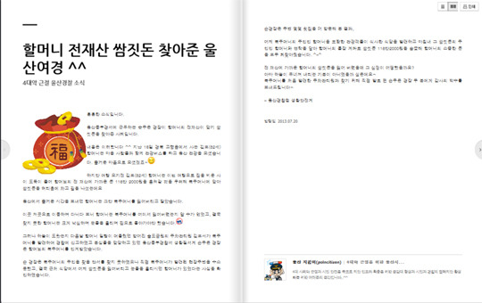 20일 울산지방경찰청 블로그에는 '할머니 전재산 쌈짓돈 찾아준 울산여경 ^^'이라는 글로 경북 고령군 고령읍에 사는 김모 할머니의 돈을 찾아준 울산 동부경찰서 생활질서계 손주은 경장의 이야기를 전했다.