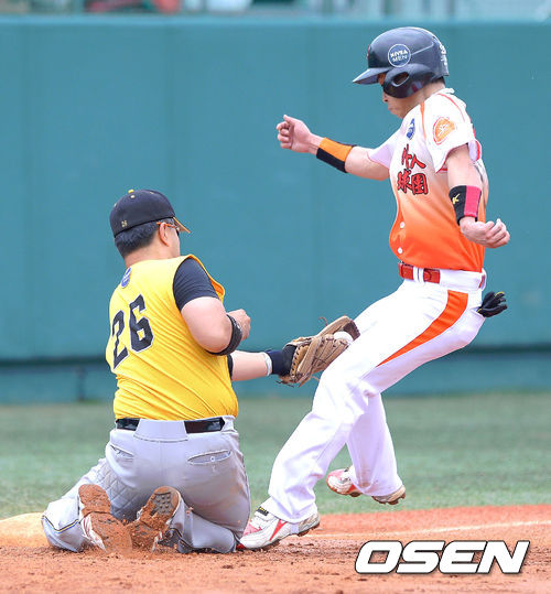 20일 오후 서울 구의야구장에서 열린 '제4회 니베아 맨 컵 전국생활체육 야구대회' 8강 챔피언과 외인구단의 경기.4회말 1사 1,2루 외인구단 지부근의 타석, 1,2루 주자의 이중도루때 2루 주자 경동호가 3루에서 아웃되고 있다.