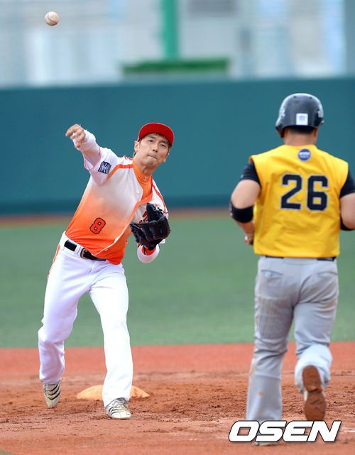 20일 오후 서울 구의야구장에서 열린 '제4회 니베아 맨 컵 전국생활체육 야구대회' 8강 챔피언스와 외인구단의 경기.4회초 1사 1루 챔피언스의 최준혁의 내야땅볼때 외인구단 이주경이 1루 주자 노희진을 포스아웃 시킨후 병살 시도했지만 실책을 범하고 있다