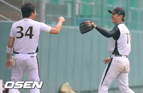 20일 오후 서울 구의야구장에서 열린 '제4회 니베아 맨 컵 전국생활체육 야구대회' 4강 위저드와 GMB의 경기. 1회초 위기를 넘긴 GMB 선발투수 이은호가 동료들의 축하를 받으며 더그아웃으로 들어가고 있다