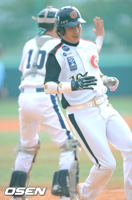 20일 오후 서울 구의야구장에서 열린 '제4회 니베아 맨 컵 전국생활체육 야구대회' 4강 위저드와 GMB의 경기.1회말 무사 1,2루 GMB 이계창의 외야플라이 타구를 위저드의 우익수가 포구 실책을 했다. 그 사이 2루 주자 방석진이 선취 득점을 올리고 있다