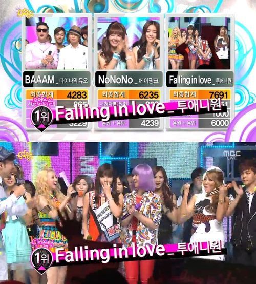 2NE1은 이날 생방송으로 진행된 '쇼!음악중심'에서 신곡 '폴링 인 러브'로 1위를 차지하고 "양현석 사장님, 테디 오빠 모두 감사드립니다"라고 말했다. 산다라는 노홍철과 저질댄스를 추며 자축했다.