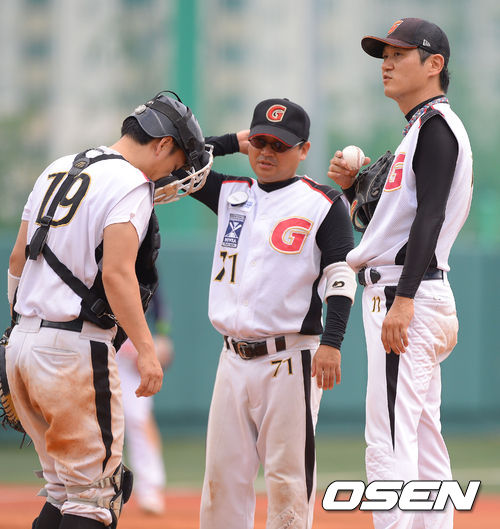 20일 오후 서울 구의야구장에서 열린 '제4회 니베아 맨 컵 전국생활체육 야구대회' 4강 위저드와 GMB의 경기, 2회초 2사 만루 위저드 두타자 연속 밀어내기 볼넷을 허용한 GMB 이은호 선발투수가 포수와 이야기를 나누고 있다.