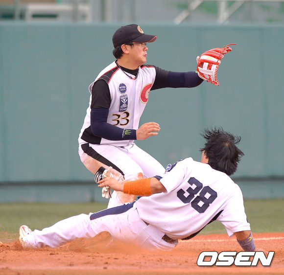 20일 오후 서울 구의야구장에서 열린 '제4회 니베아 맨 컵 전국생활체육 야구대회' 4강 위저드와 GMB의 경기, 3회초 2사 1루 위저드 이명희의 타석때 1루주자 안영훈이 2루 도루 시도했다. GMB 포수의 송구 실책을 틈타 안영훈이 3루까지 진루하고 있다.