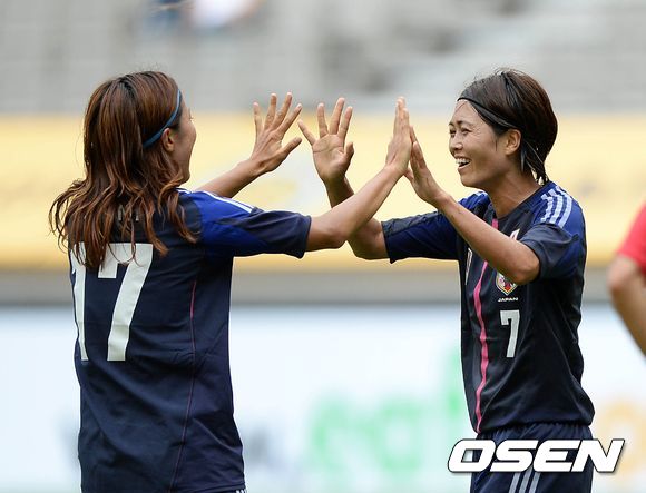 전반 일본 안도가 선제골을 성공시키고 동료들과 환호하고 있다.