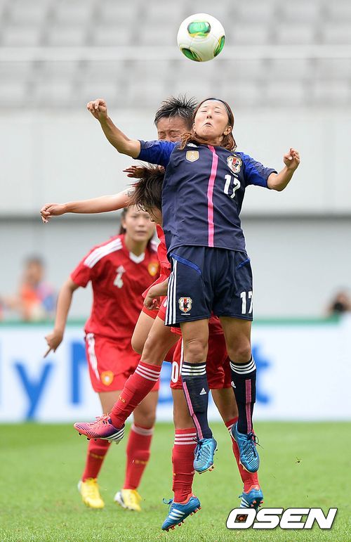 전반 일본과 중국 선수들이 공중볼 다툼을 하고 있다.