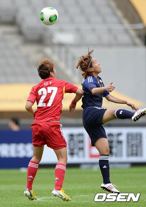 전반 중국과 일본 선수들이 공중볼 다툼을 하고 있다.