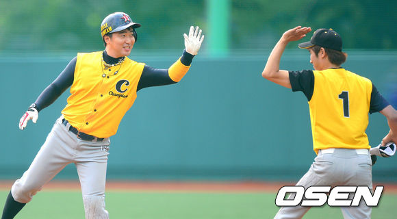 20일 오후 서울 구의야구장에서 열린 '제4회 니베아 맨 컵 전국생활체육 야구대회' 챔피언스와 블렛츠의 4강전. 1회초 2사 만루 챔피언스 윤준범이 1타점 적시타를 날리고 하이파이브를 하고 있다