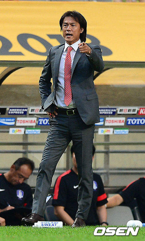 홍명보 감독이 선수들에게 작전 지시를 하고 있다.