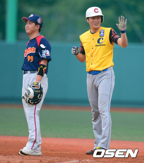 20일 오후 서울 구의야구장에서 열린 '제4회 니베아 맨 컵 전국생활체육 야구대회' 챔피언스와 블렛츠의 4강전. 4회초 2사 2,3루 챔피언스 대파 문순환이 2타점 적시타를 날리고 미소 짓고 있다.