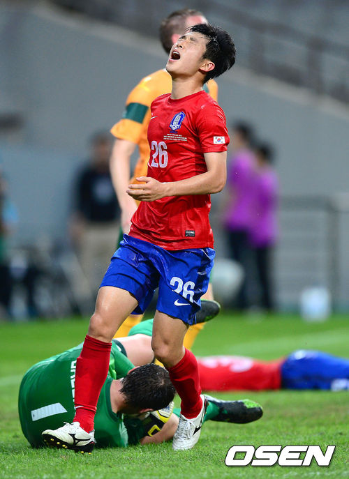 전반 한국 이승기가 찬스를 놓치고 아쉬워하고 있다.