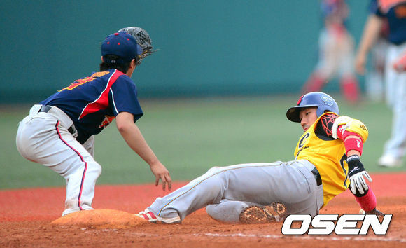 4회초 2사 2루에서 챔피언스 최준혁이 적시타를 날린 후 3루에 세이프되고 있다. /박준형 기자 soul1014@osen.co.kr