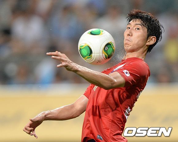 전반 한국 김동섭이 동료의 센터링을 가슴으로 받아내고 있다.