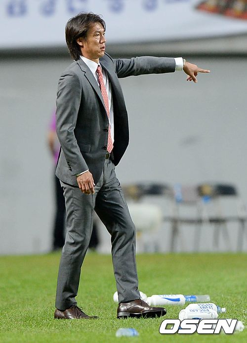 전반 한국 홍명보 감독이 선수들에게 작전을 지시하고 있다.