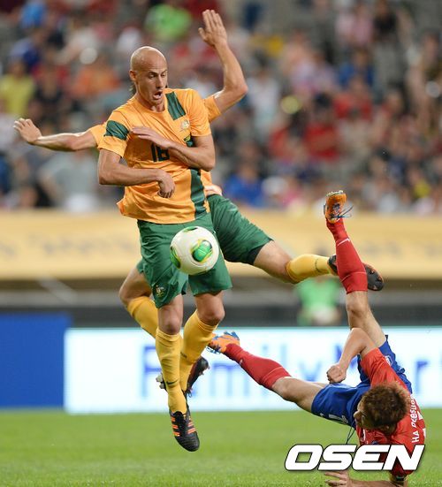 전반 한국 하대성이 호주 문전에서 오버헤드킥을 시도하며 넘어지고 있다.