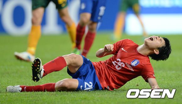 후반 한국 이승기가 자신이 쏜 슛이 호주 수비에 맞고 골문을 벗어나자 아쉬워하고 있다.