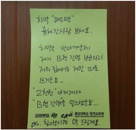 내용을 살펴보면 치약 도둑을 오히려 걱정하는 내용이 주를 이룬다는 점에서 웃음을 자아내고 있다. 다름 아닌 치약을 도둑 맞은 이가 B형 간염 보균자라는 점 때문이다.
