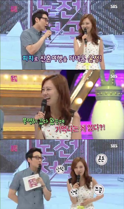 장윤정은 21일 방송된 SBS ‘도전 천곡’에서 MC 이휘재가 “피지로 신혼여행을 갔다 왔는데 뭐가 제일 기억에 남냐”고 묻자 “기억이 안난다”고 말했다.