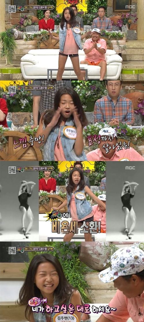 이에 김흥국은 "트로트를 하면 돈이 되기 때문"이라고 답해 웃음을 자아냈다. 그러나 이내 "(주현이가) 댄스대회에 나가서 상을 타고 그랬다"며 딸의 춤실력에 대해 자신감을 보였고, 주현 양은 MC들의 요청에 따라 무대 중앙으로 나가 팝스타 비욘세의 '싱글 레이디'에 맞춰 수줍급 춤실력을 발휘했다.
