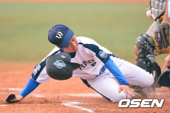 21일 오후 서울 구의야구장에서 '제4회 니베아 맨 컵 전국생활체육 야구대회' 챔피언스와 위저드의 결승전이 열렸다. 1회말 위저드 공격 2사 1, 2루 상황 6번타자 김경섭의 1타점 적시타 때 2루 주자 조창현이 홈으로 쇄도해 세이프 되고 있다.